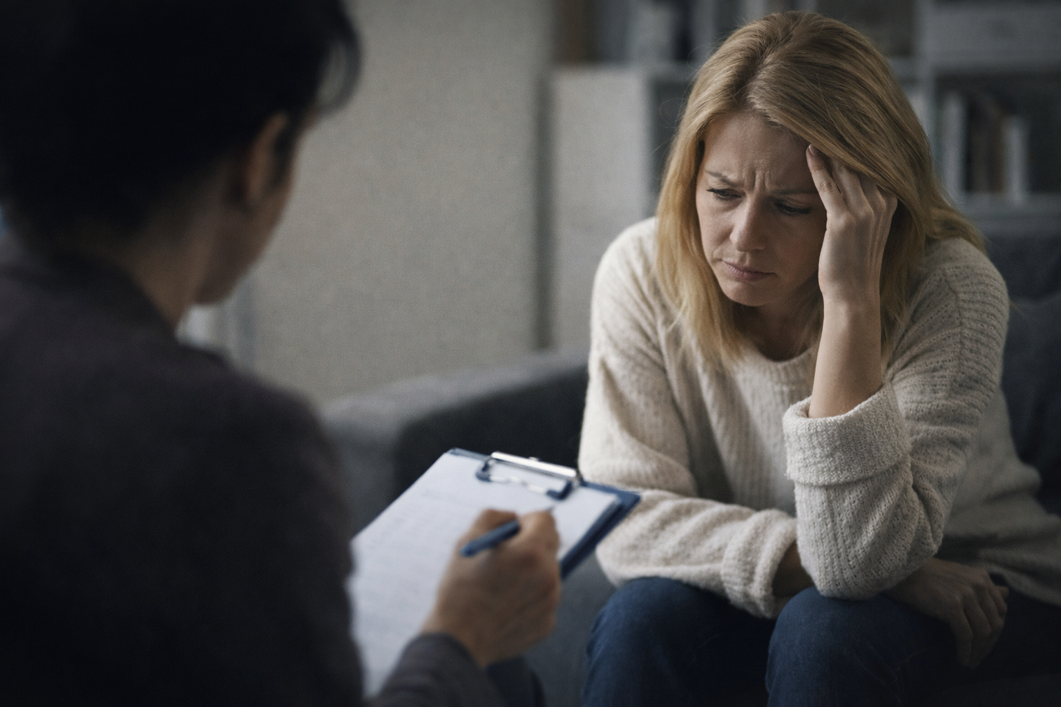 A woman sits with her head resting on her hand while speaking to a practitioner who is taking notes. Her expression shows stress and emotional fatigue.