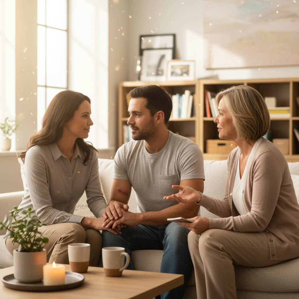 Couple receiving relationship coaching support, representing emotional healing, communication skills, and nervous system regulation.