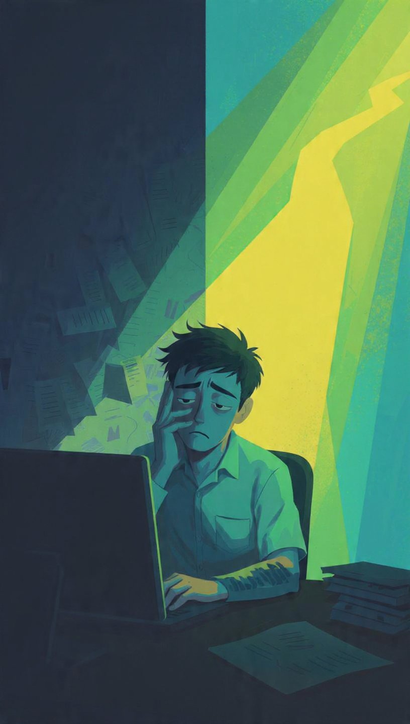 A stylized illustration shows a tired man sitting at a computer with his head resting in his hand. Papers and dim lighting suggest work overload and chronic stress.