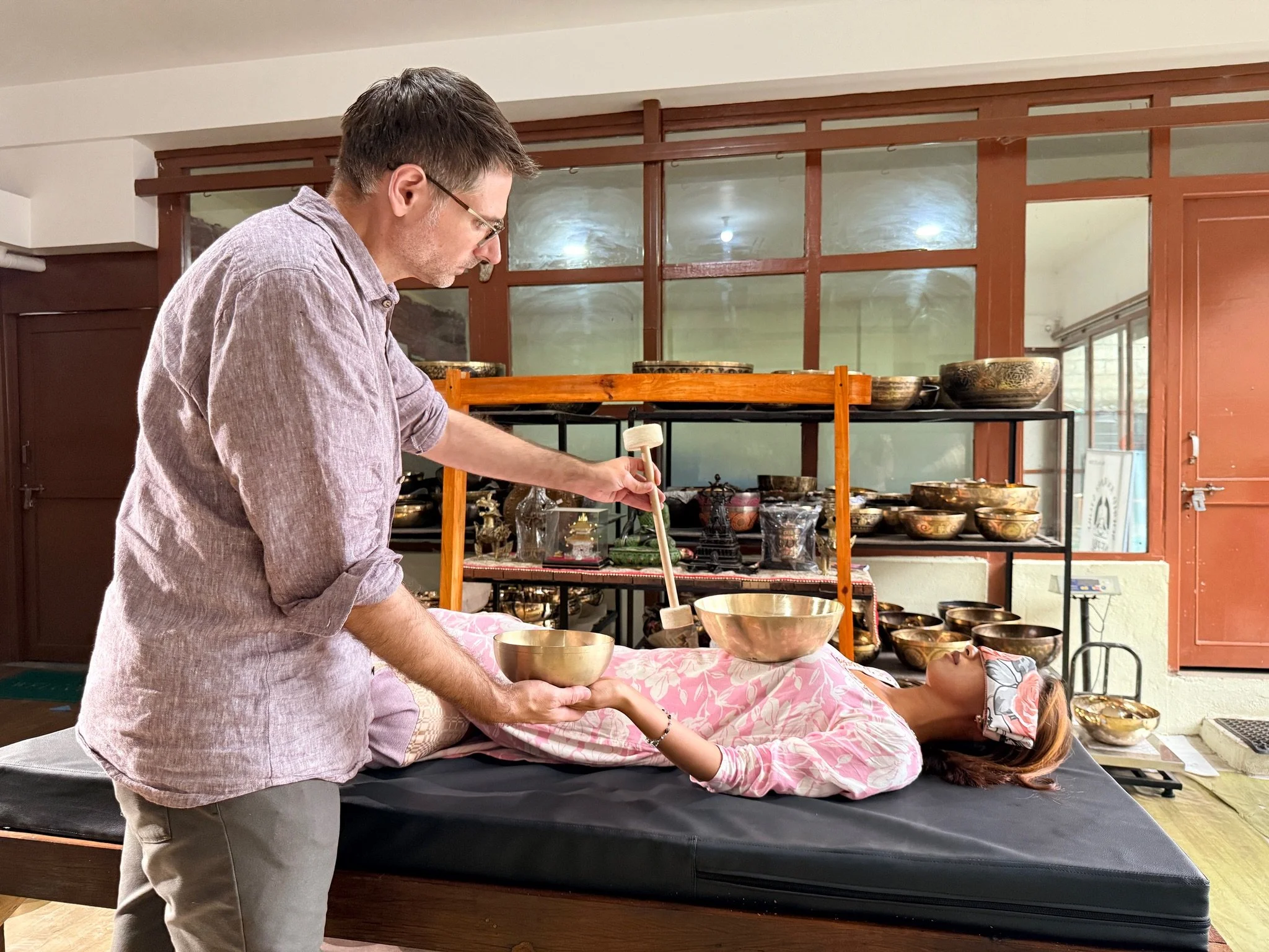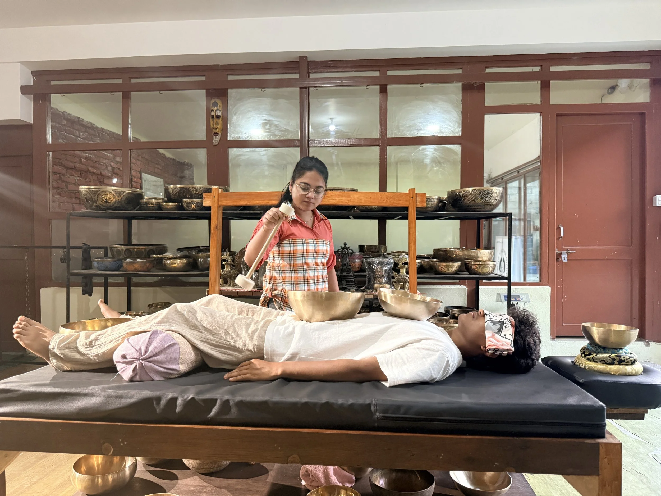 Low, steady vibrations from Himalayan singing bowls help the body settle. Slow rhythms calm the fight-or-flight response. Grounding tones around the pelvis and feet bring a sense of being held.